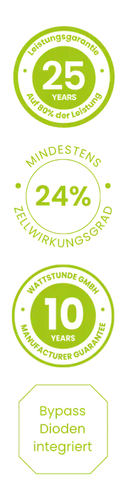 WATTSTUNDE unterstreicht die Qualität mit einer 10-jährigen Produktgarantie sowie einer 25-jährigen Leistungsgarantie auf mindestens 80 % der Nennleistung – für langfristige Sicherheit und zuverlässige Performance.